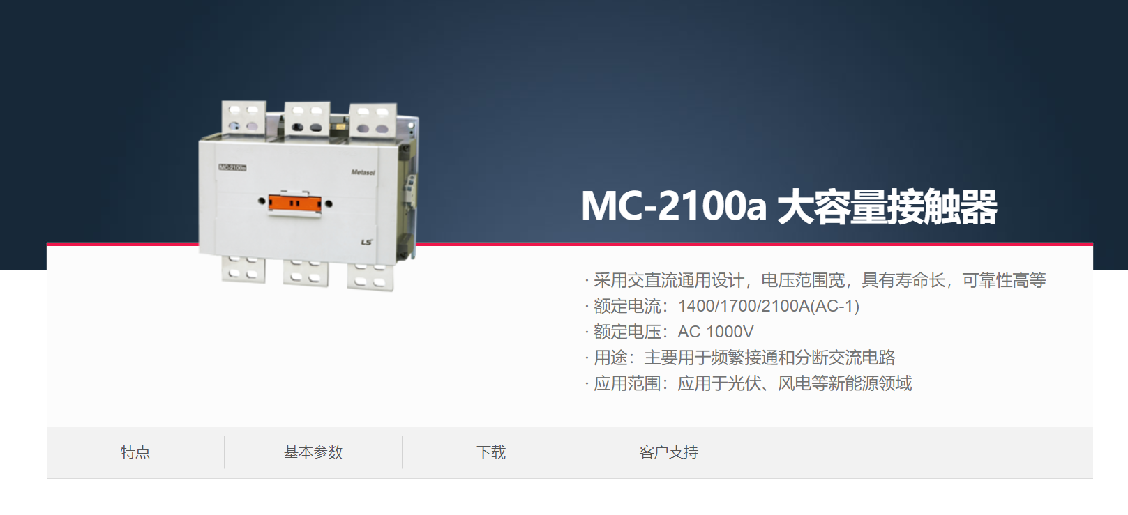 當前位置網(wǎng)站首頁 > 產(chǎn)品展示 > LS產(chǎn)電電氣元器件 > 接觸器(MC)&熱過載繼電器(MS) > MC-2100a 大容量接觸器 >